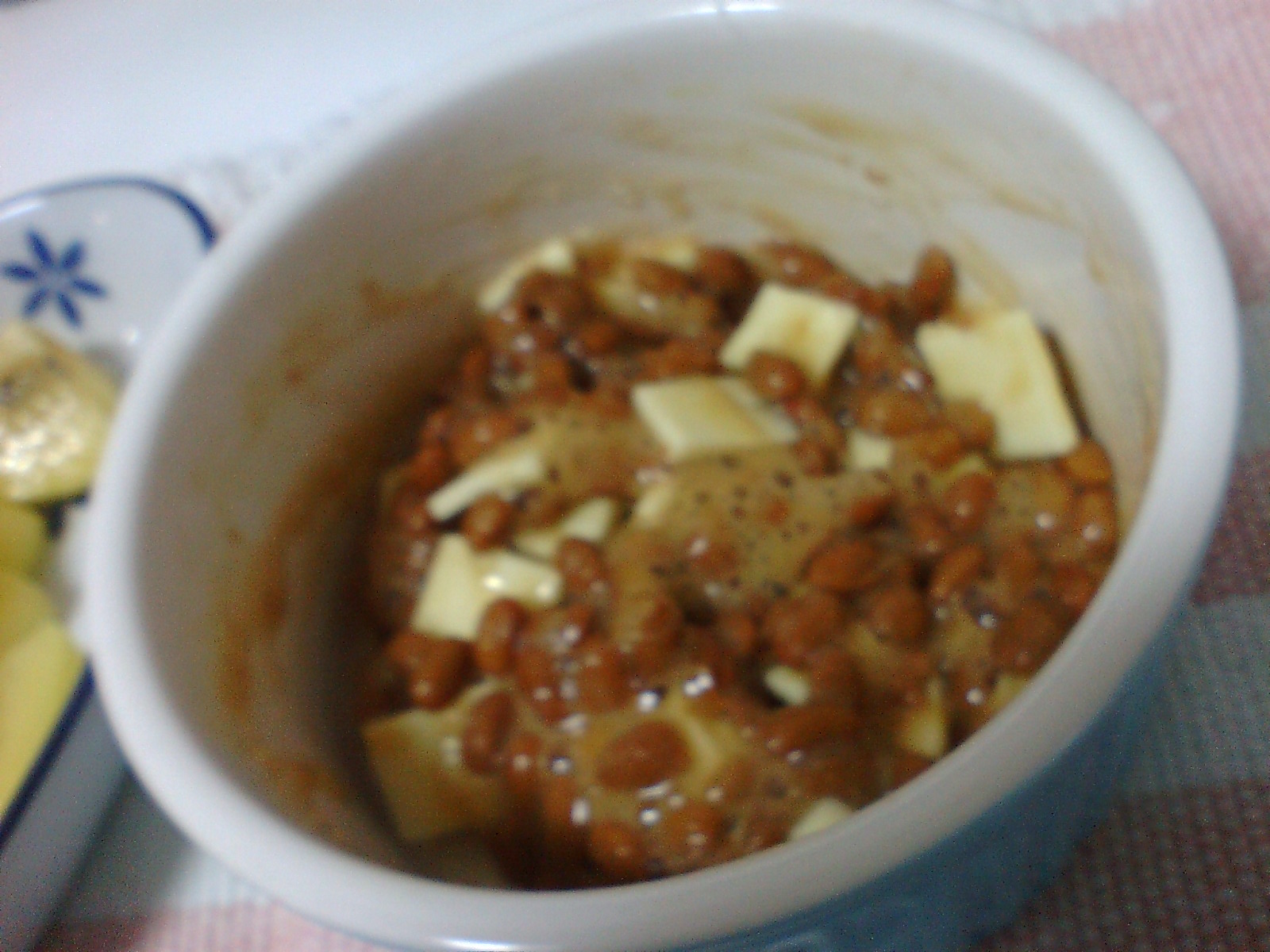 納豆チーズ 納豆は醗酵食品と一緒に摂ると腸内の善玉菌が増えると聞いて実行している(´・ω・`)いつもはキムチだけどキムチが昨日の朝で切れたので今回はチーズを入れてみた。これきっとダメな人は食べられない一品だと思う。ワタシは好きだけどねw納豆を食べられないとなんか損な気しない?w