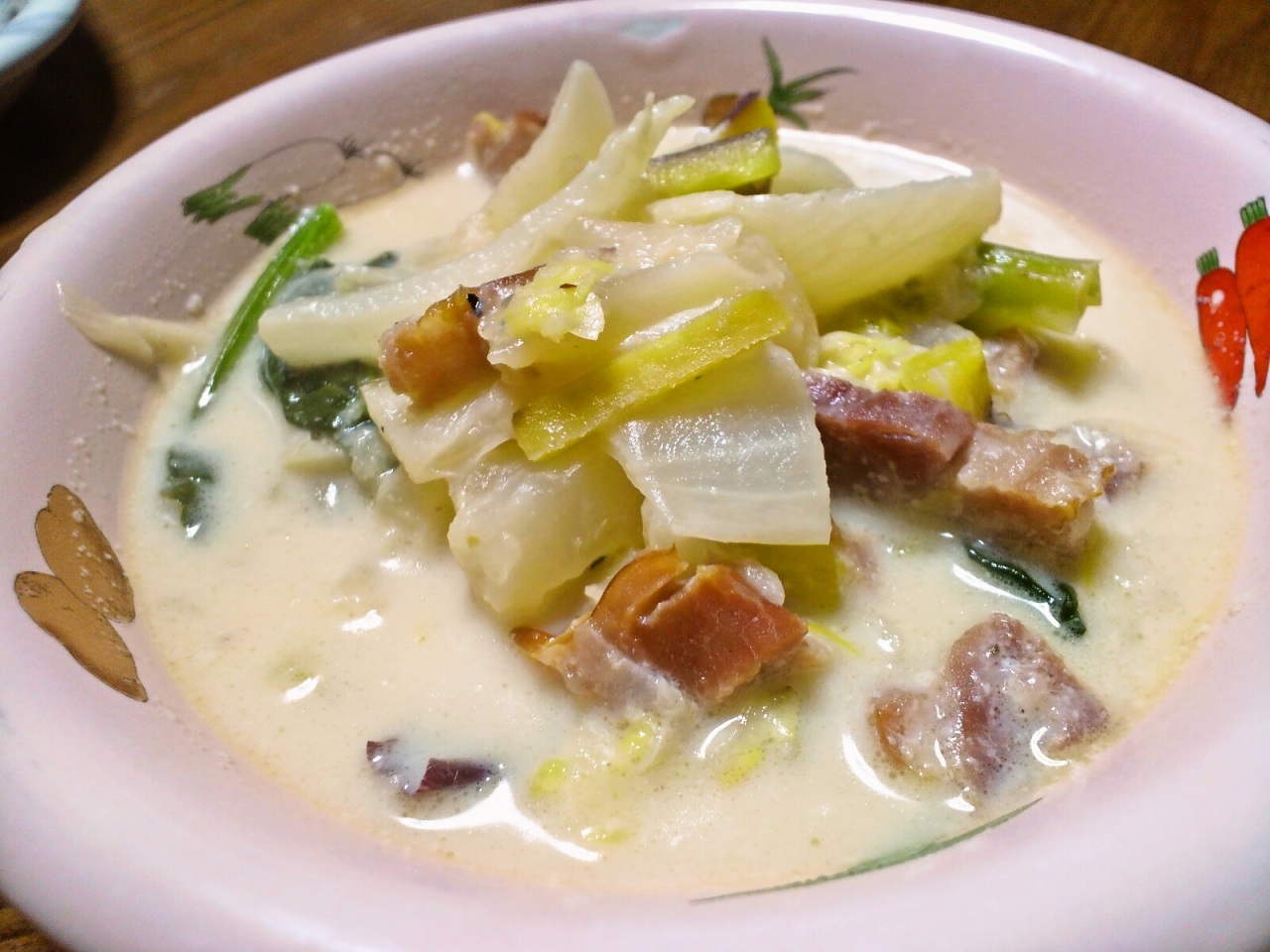 カブと白菜の牛乳スープ いつもこつぶさんのレシピ『白菜とかぶのあったかミルクスープ』白菜、ネギの白いところ、カブとさつまいもでほんのり甘いスープになってます(*´∇`*)ベーコンがなかったので焼豚で代用(笑)