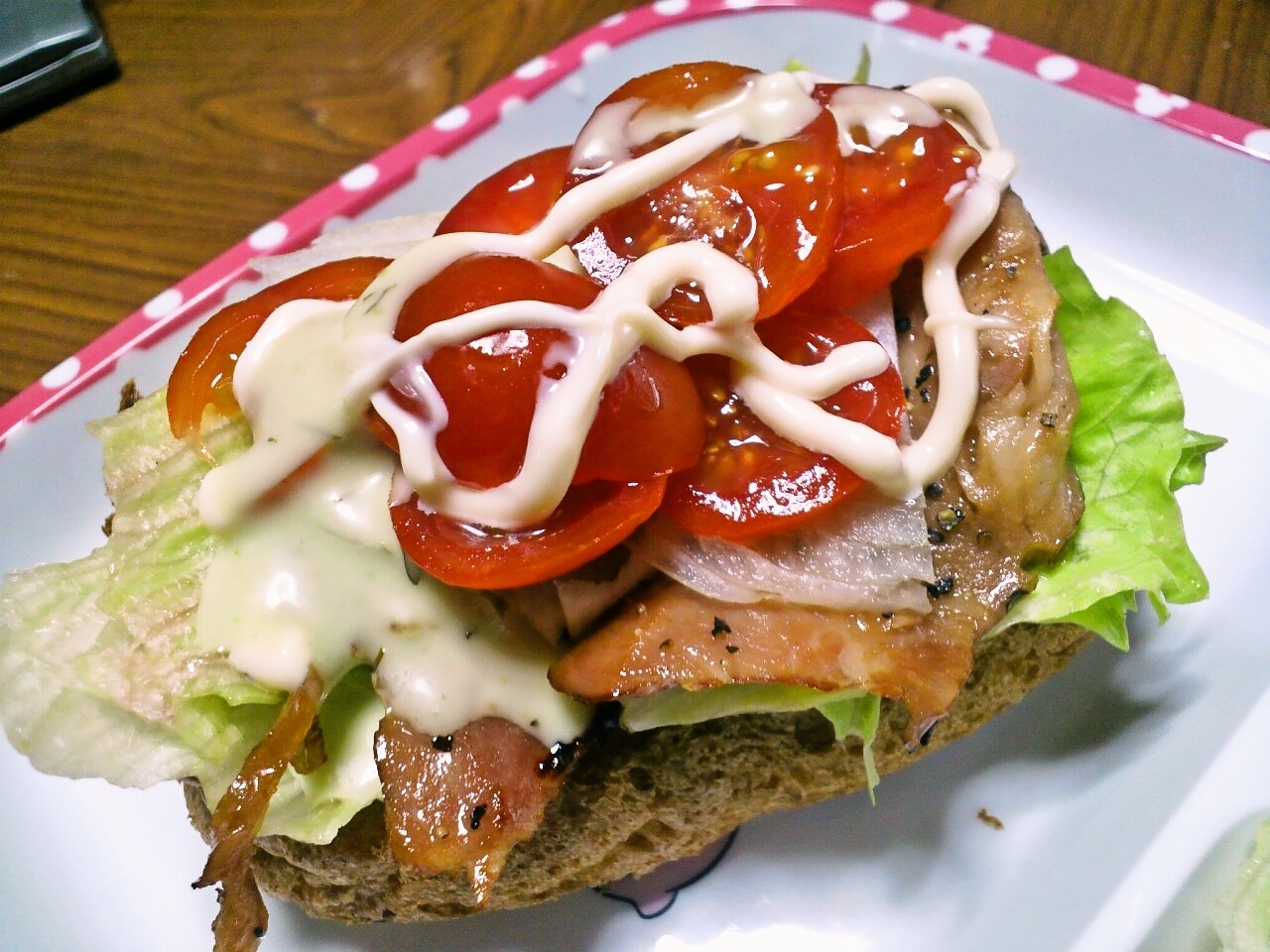 自家製のご飯パンの上にレタス、薄切りチャーシュー(ハムやベーコンの代わり)、スライスオニオン、ミニトマトを乗せたパンでした。