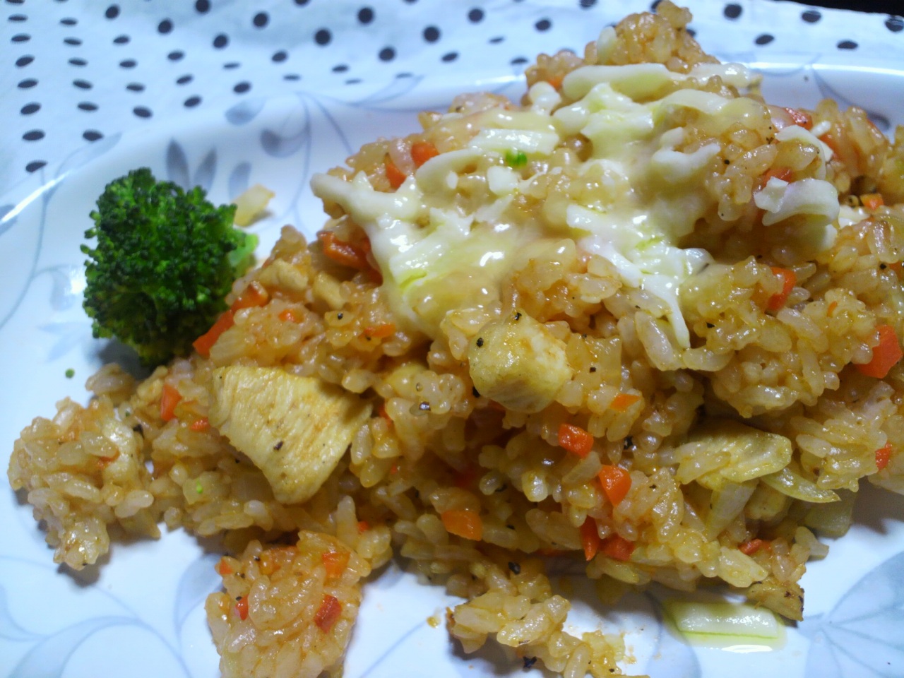 チキンライス 本当はオムライスを作る予定だったんだが、途中ケチャップがなくなるというアクシデントが発生。卵の上ににラクガキ出来ないなんて…!!テンション下がったのでただのチキンライスになりました(・ω・)
