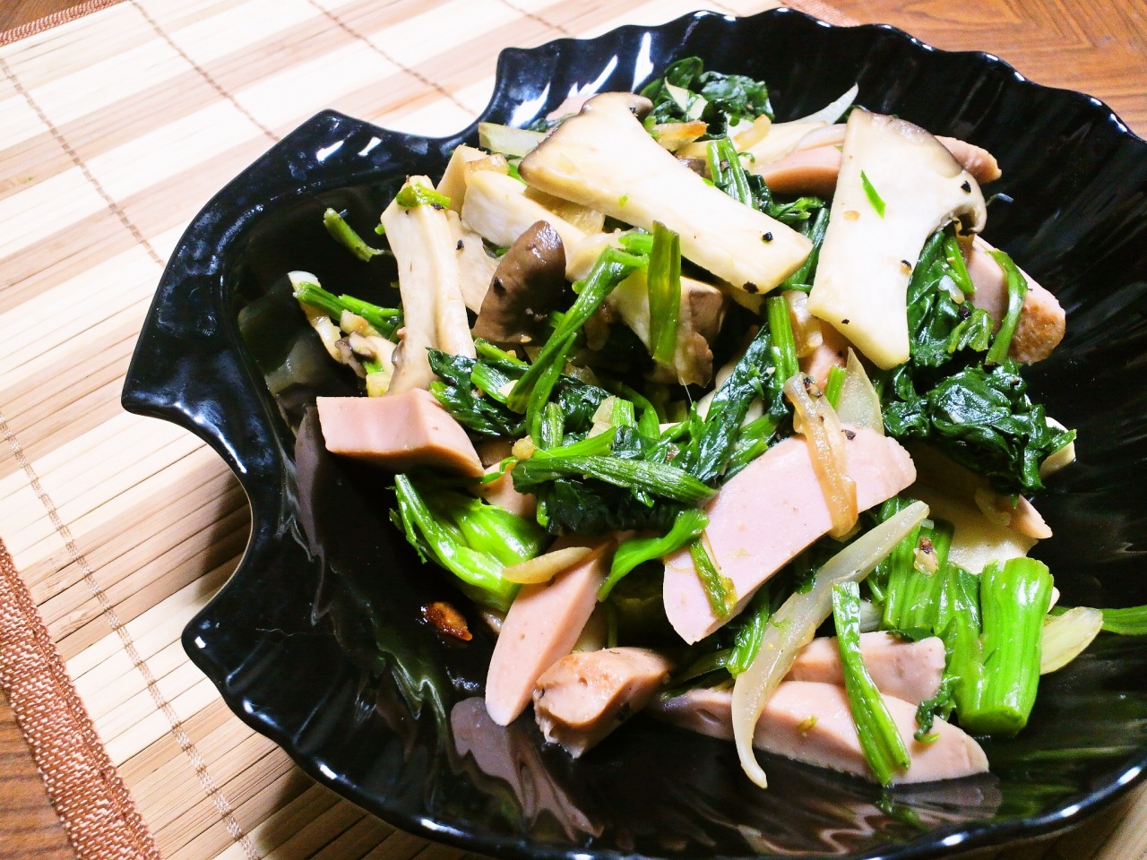 エリンギとほうれん草と魚肉ソーセージの炒め物