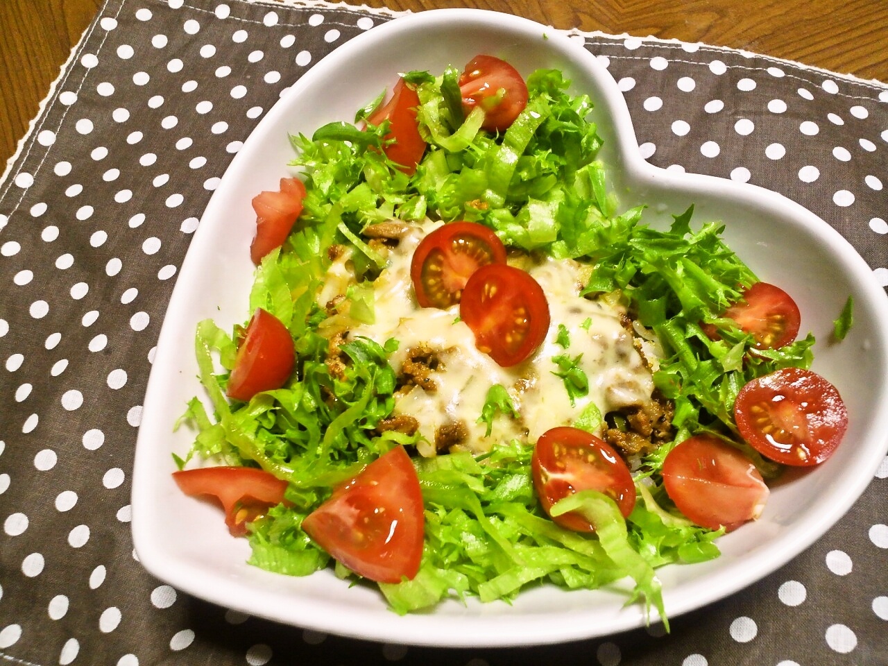 Dチーズが溶けたらレタスとトマトを盛り付けて出来上がり!