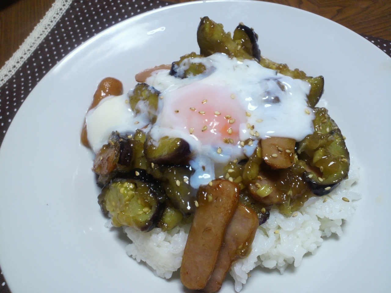 ナスとソーセージの温玉プレート